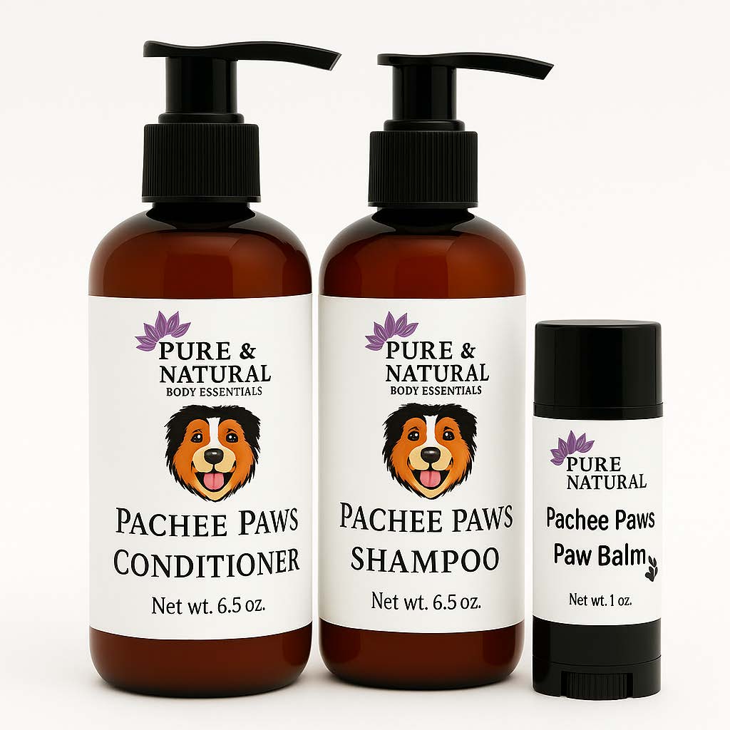 The Pachee Paws Natural Pet Care Set is a complete, plant-based grooming trio designed to keep your dog clean, soft, and comfortable. Handcrafted in Michigan, this set includes a natural shampoo, hydrating conditioner, and a soothing paw balm made for dry, sensitive, or active pets.